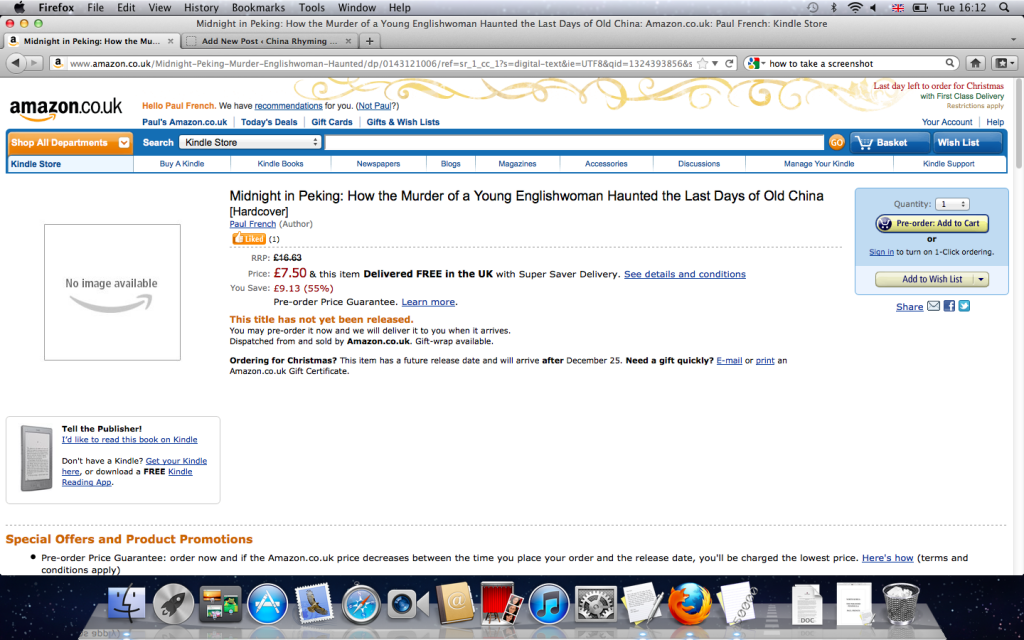 Not sure how this discounting thing works but pre-order Midnight in Peking on Amazon.co.uk and you get a discount – best seller futures I guess!!