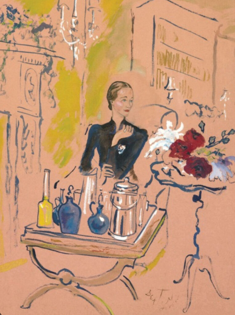 Posted: October 16th, 2025 | No Comments »I’ve posted this sketch of Wallis Simpson before – Wallis Simpson Serving Cocktails, London, 20 November 1936, a Cecil Beaton gouache featuring Wallis signature China-inspired chignon hairstyle and Mainbocher interpretation of a qipao. But I hadn’t realised it was owned by the fashion designer Dries Van Noten.