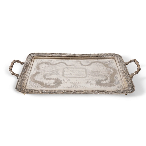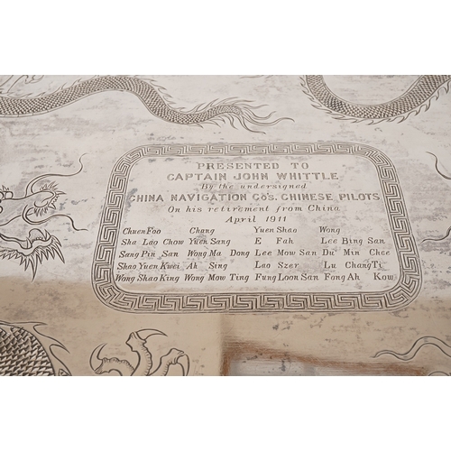 Posted: October 18th, 2025 | No Comments »An early 20th century Chinese white metal two handled rectangular tea tray, by Luen Wo of Shanghai, with engraved presentation inscription, ‘Presented to Captain John Whittle by the undersigned China Navigation Cos. Chinese Pilots on his retirement from China, April, 1911’. Whittle had been a Captain with Swire’s China Navigation since at least the 1880s, most notably commanding the well known China coastal passenger and cargo steamer Tamsui.