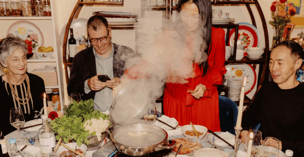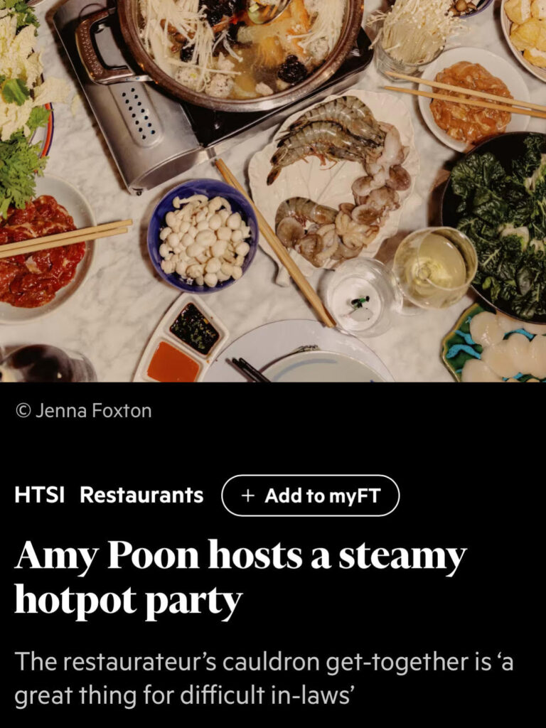 “Amy Poon hosts a steamy hotpot party. Immense fun to be fed by the legendary Amy Poon, watered by her sommelier smart husband Michael Mackenzie and be photographed by the FT. All in the company of eminent travel writer Colin Thubron and his wife the Shakespeare scholar Margreta de Grazia, Booker Prize-longlisted novelist Tash Aw, food writer Fuchsia Dunlop, author Paul French and SOAS student Alegra Giercke, whose family runs the Genghis Khan Retreat in Mongolia. Their conversation ranges from the intellectual to the naughty, taking in Wham!’s tour to China in the 1980s and how to cook a Mongolian camel’s pizzle along the way.”