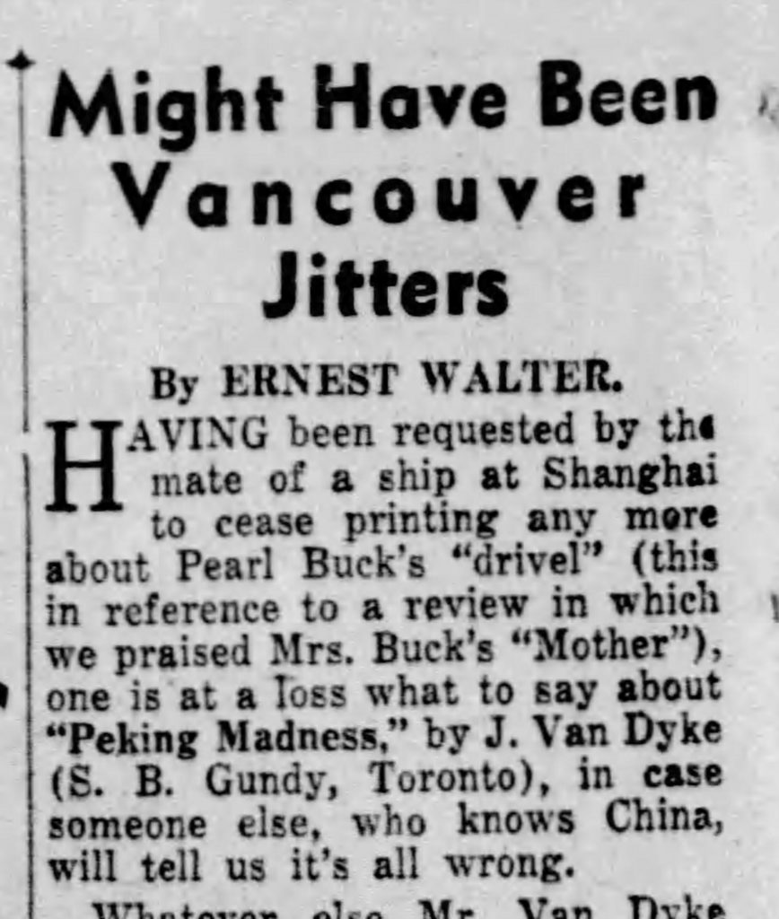 I have to admit (though I know she still has legions of fans) that I’m generally with ‘the mate of a ship at Shanghai’ when it comes to Pearl Buck – “drivel”. However, Van Dyke’s Peking Madness is not one of the great classics of Peking ‘Foreign Colony’ writing either it must be said….But it’s nice to see a bit of pushback against Buck in 1934….