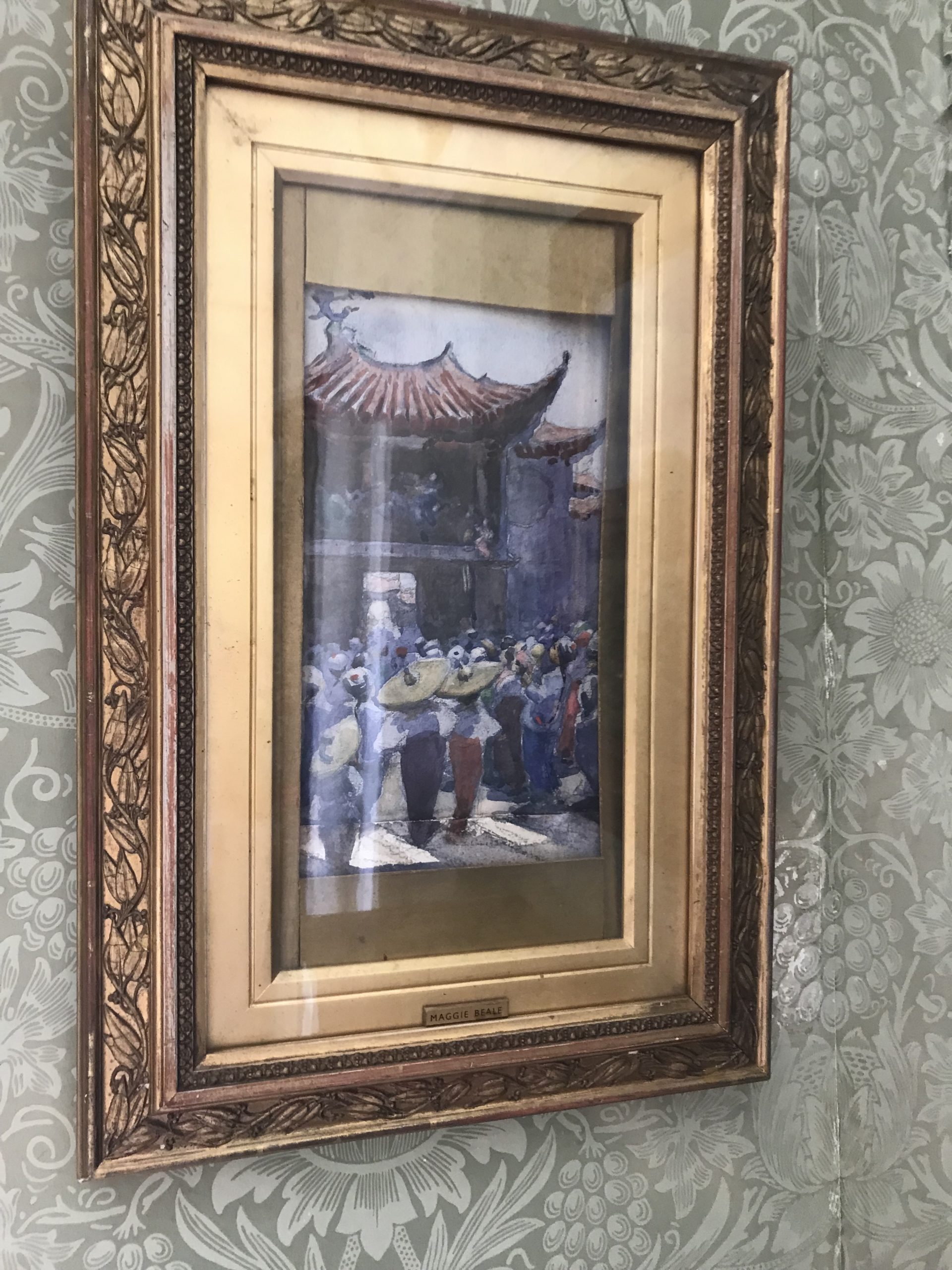 Obviously the image is of Japan, probably Yokohama where the Standen owning Beale’s visited and labelled “Maggie Beale”. However, it is in a distinctly different style to the works by Margaret Beale and, I believe, this one is by the Margaret Beale who owned Standen and labelled “Maggie Beale” to differentiate from Margaret Beale. At least that’s my theory. And it’s quite a nice piece too….