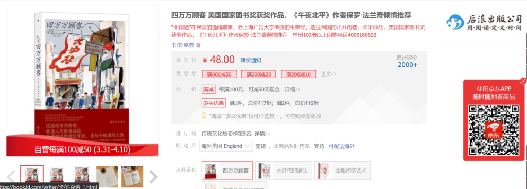 Delighted that Post Wave Publishing Co/Ginkgo Books in Beijing has published a Chinese translation of Carl Crow’s Four Hundred Million Customers (1937) (there’s a link to an English language edition here) with all the Sapajou illustrations & a new introduction to Crow for Chinese readers by me…if you want to buy a copy there’s a link here on JD and here on Dangdang.