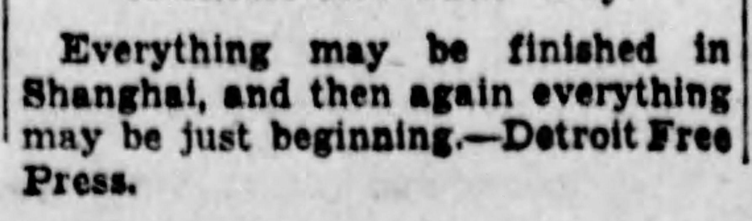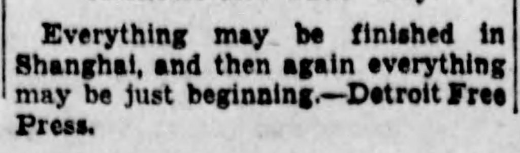 Shanghai’s going through a hard time right now. It was in 1932 too after a blistering Japanese attack on the city that devastated some quarters and led to many destroyed buildings, an entire lost library (the best in the city) and many fatalities. The Detroit Free Press asked this question in March 1932, perhaps apposite today too…