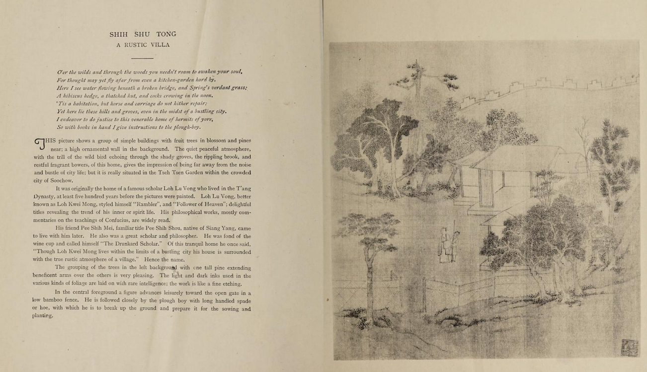 An Old Chinese Garden – a 3-fold work of poetry, calligraphy and painting – Calligraphy and Painting by Ming dynasty artist Wen Chen Ming (Wen Zhengming); studies written by Kate Kerby; translations by Mo Zung Chung published by Chunghwa Book Company, Shanghai, China, 1923. You can see the whole book online here… The book blends Chinese aesthetics with Western scholarship. Chunghwa Publishing of Shanghai was a large publishing concern (along with the Commercial Press and Kelly & Walsh) in Shanghai in the first decades of the twentieth century. I’m afraid I do not know who Kate Kerby was except she dedicates the book to her husband Philip Kerby, the author of 1927’s Beyond the Bund (see tomorrow’s post)? Art historian Craig Clunas tells me the original Wen Chen Ming album reproduced in An Old Chinese Garden is now considered “lost” – unless anyone has it in their attic?