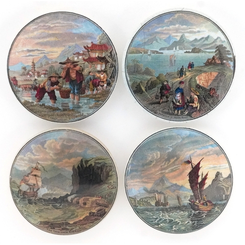 Four Victorian prattware (a style of English earthenware produced from roughly 1780-1840 by F & R Pratt & Co. of Staffordshire) pottery pot lids comprising top left and right – Transplanting Rice and The Harbour of Hong Kong and bottom left to right The Chin-Chew River, and The Ning Po River. The pots were produced by the Pratts Factory in or around 1846 -1849 and may have been influenced by the then Second Opium War with China. The images are reproductions of watercolours by J.Austin from the originals by Thomas Allom in the then popular book China Illustrated (1845). Allom (who never went to China) was inspired well by sketches made by Captain Stoddart (a Royal Navy officer and artist in the First Opium War).