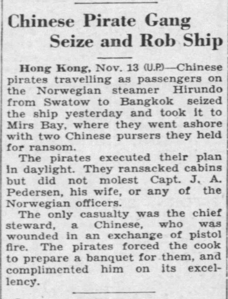 The Norwegian-built steamship Hirundo (built 1926) was a general cargo vessel associated with trading along the China coast, based out of Swatow. In this instance it seemed a normal pirate raid. Cabins were trashed, stuff stolen, a crew member wounded but fortunately nobody killed (which did happen often sadly). But the pirates commanding the chef to prepare them a banquet and complimenting him on its excellence is a rather classy touch I have to say….