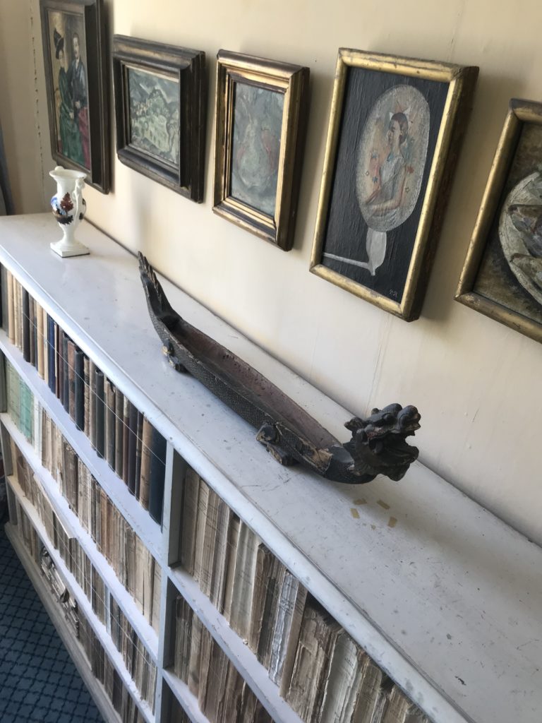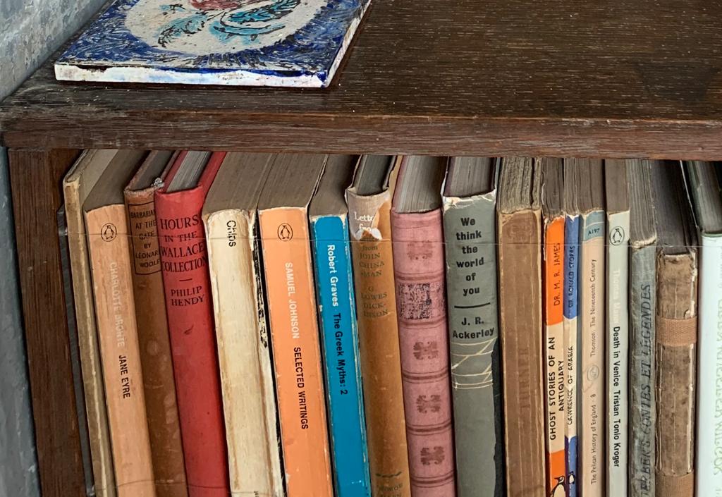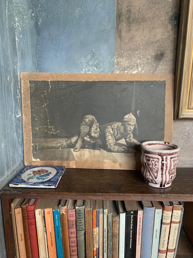 bookshelf in Duncan Grant’s studio with a photograph of Nijinsky