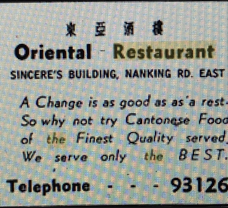 The Oriental Restaurant was inside the Sincere Department Store on Nanking Road (Nanjing East Road now). The old department store building with its distinctive clock tower still stands on the corner with Chekiang Road (Zhejiang Lu), just as it has since 1917. It’s the rather dismal Bailian store today with no food options to rival the once highly rated Cantonese restaurant, The Oriental. It was there from at least the early-1930s through to 1949.