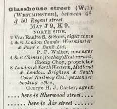 Yesterday i posted about the destruction of No.4-6 Glasshouse Street, just off Piccadilly. The building was the original home of the first Chinese restaurant in the West End. Here is the 1921 entry for the restaurant and its owner Mr Chong Choy from the Post Office Directory for London…