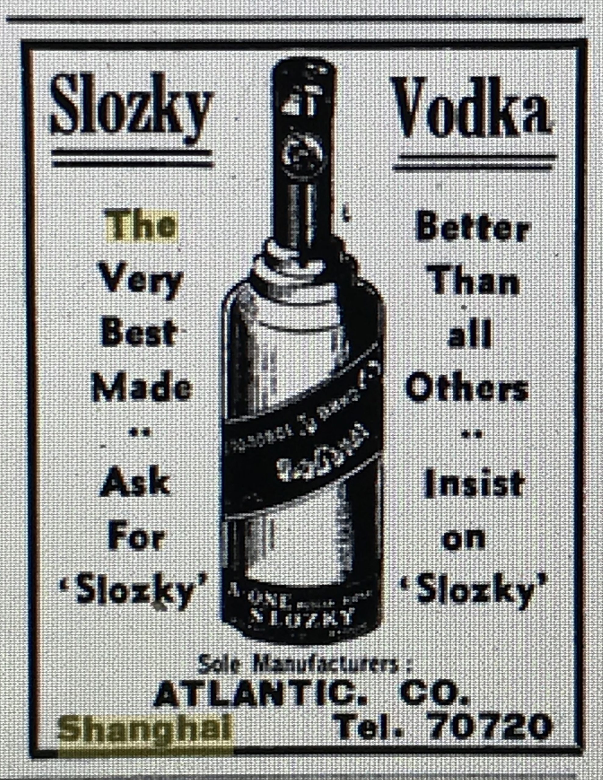A little mystery here – an advert in Shanghai for Slozky Vodka from the 1930s. The usual sort of marketing – the ‘best’, ‘ask for’ etc. However, I can find no other references to Slozky Vodka from the 1930s or any other time period?