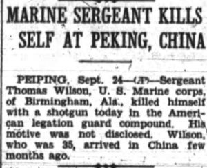 Sergeant Thomas Wilson, 35 years old, of the United States Marine Crops was rotated to Peking in the summer of 1933 to join the Legation Guard protecting the American Consulate in the city. On September 24th he killed himself with his shotgun in Legation Guard Barracks (below) just adjacent to the consulate compound (which you can still walk across today). The suicide caused chaos momentarily in the compound as it was close to the residence of the US Minister to China Nelson T Johnson.
