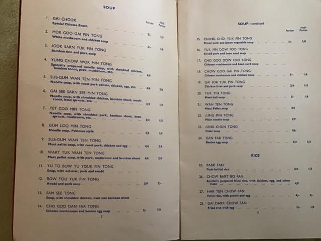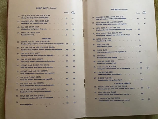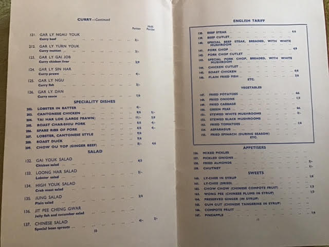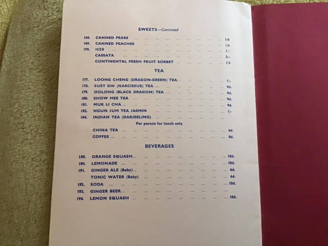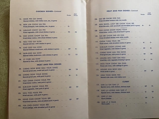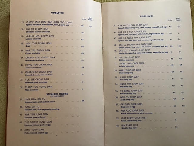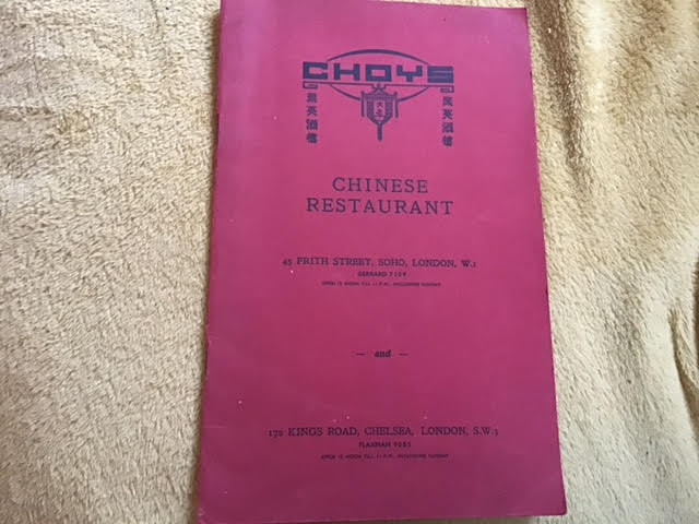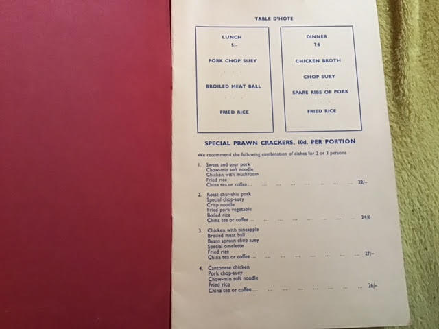 I posted some time ago about Choys, one of post-war London’s best known and much loved Chinese restaurants on Frith Street, Soho. You can see that post here. My thanks then to ChinaRhyming reader Jonathan Sanders for sending me a menu from the 1950s that his mother kept after visiting the restaurant as a young woman. Quite extensive and well worth reading through. I would note that no alcoholic drinks are included. Most Chinese restaurants were not licensed (I suppose due to the ever-arcane UK licensing laws), however arrangements were made with pubs in the area – the old Shanghai Restaurant on Greek Street, round the corner, had a deal with the old Pillars of Hercules pub (recently sadly gutted and turned into some non-entity of a bar) next door to deliver in beer and wine.