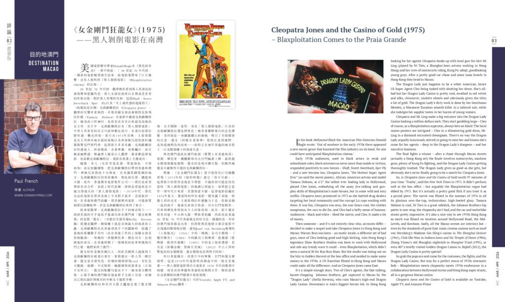 My bimonthly column for Macau Closer (that appears in English, Portuguese and Chinese handily) this March-April looks back at when Hollywood’s Blaxploitation genre took a side trip to Hong Kong and Macao (in league with the Shaw Brothers) in Cleopatra Jones and the Casino of Gold (1975) with Tamara Dobson and Ni Tien teaming up to take on bad-ass Macao casino boss played by Stella Stevens. If you’re in Macao then you can pick up a copy at the marvellous Livraria Portuguesa at 16 rua de São Domingos. Otherwise you can zoom in on this jpg hopefully.